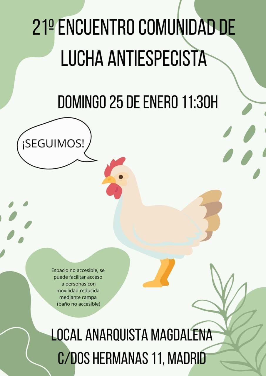 El próximo domingo 25 de enero a las 11:30h tendrá lugar en el Local Anarquista Magdalena un nuevo encuentro con el que seguir dando forma a la comunidad de lucha antiespecista, ¡anÃmate a venir!
