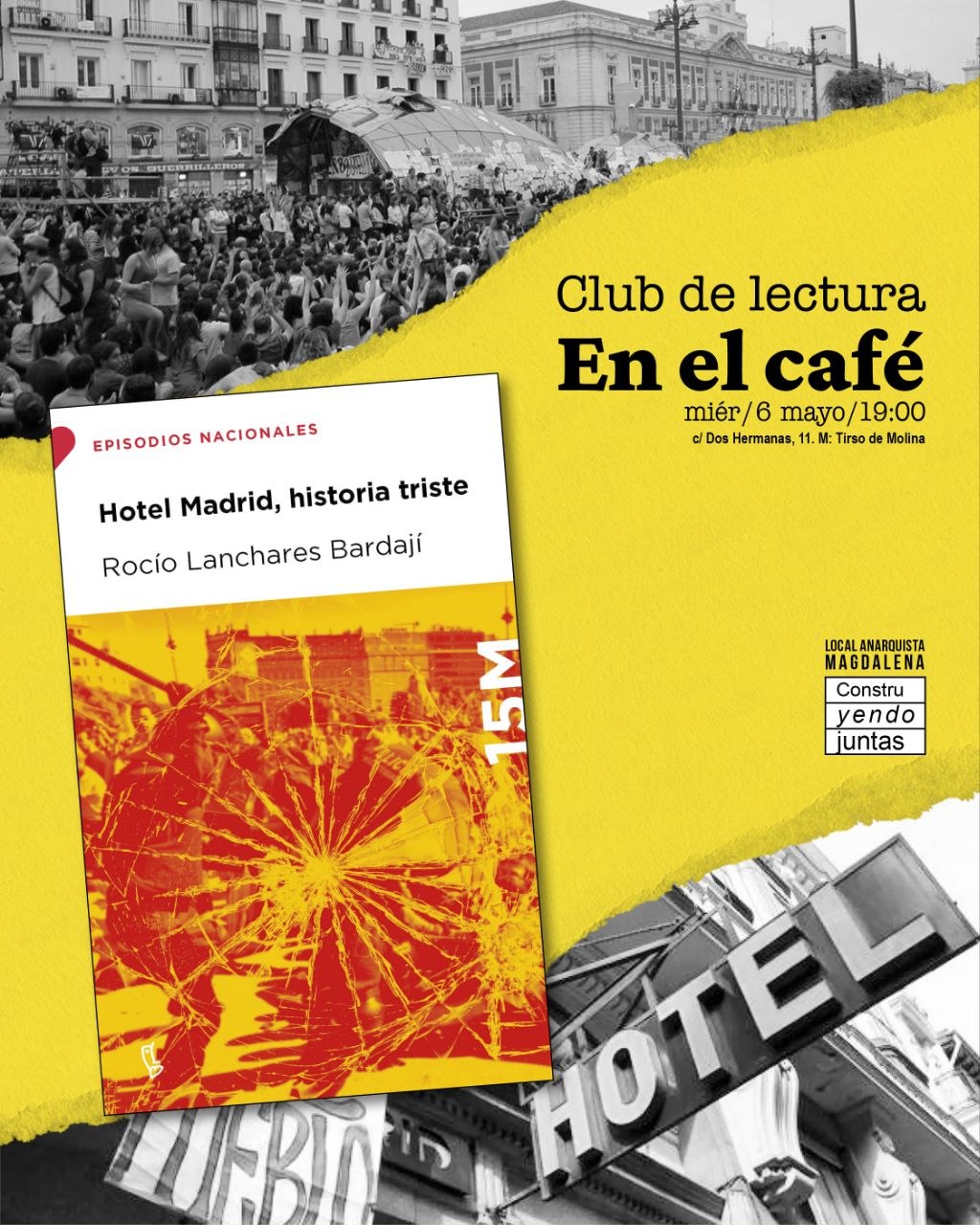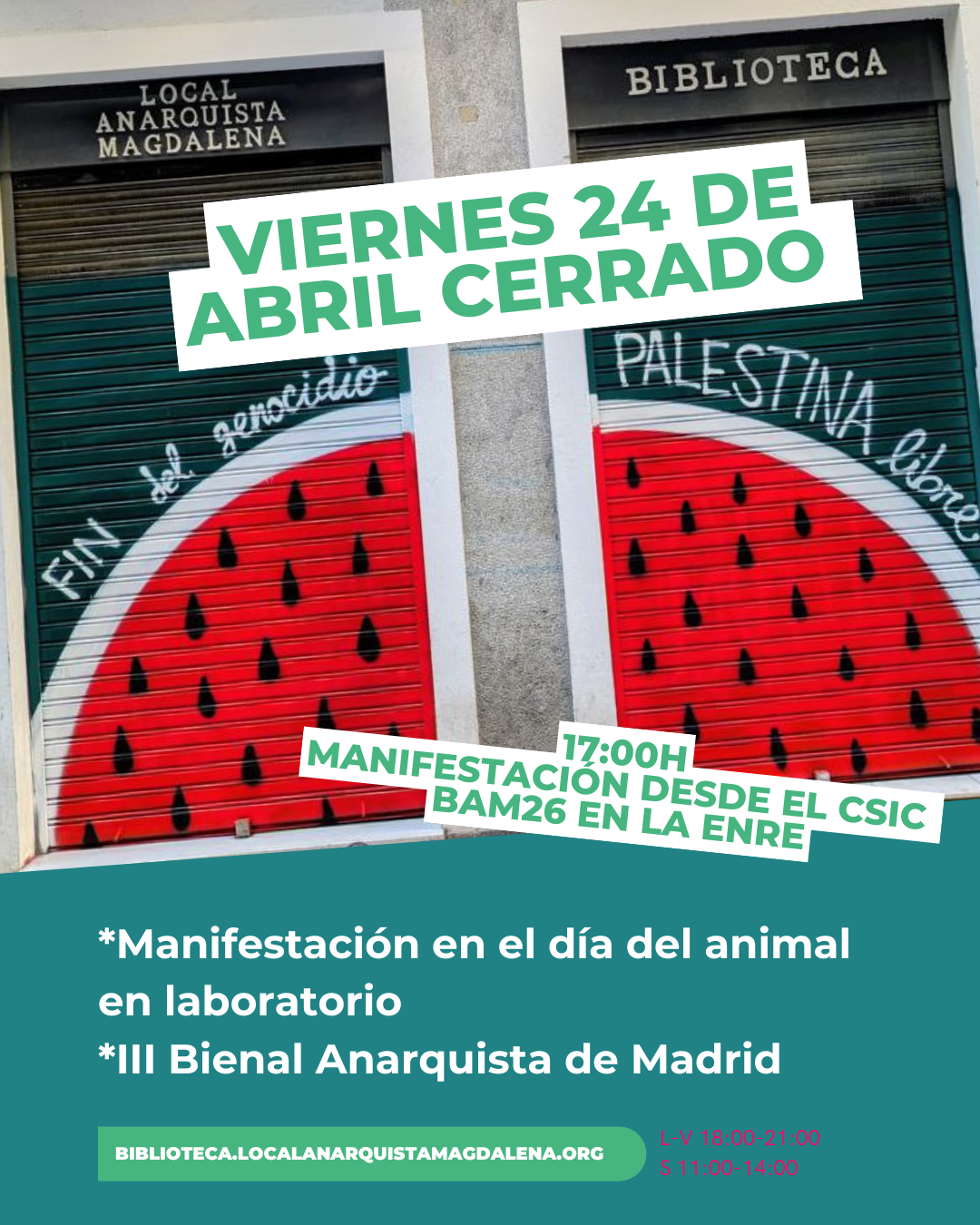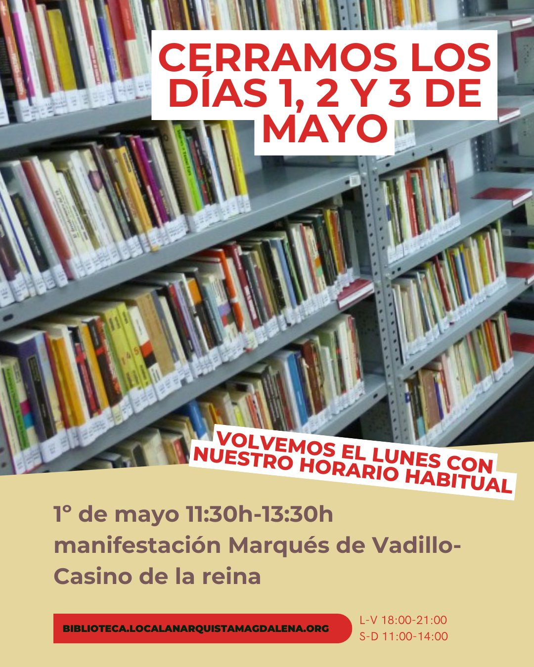 Esta semana cerramos el local desde el viernes 1 de mayo hasta el domingo 3. Os animamos a acudir a la manifestación convocada el mismo viernes a las 11:30 con salida desde Marqués de Vadillo.