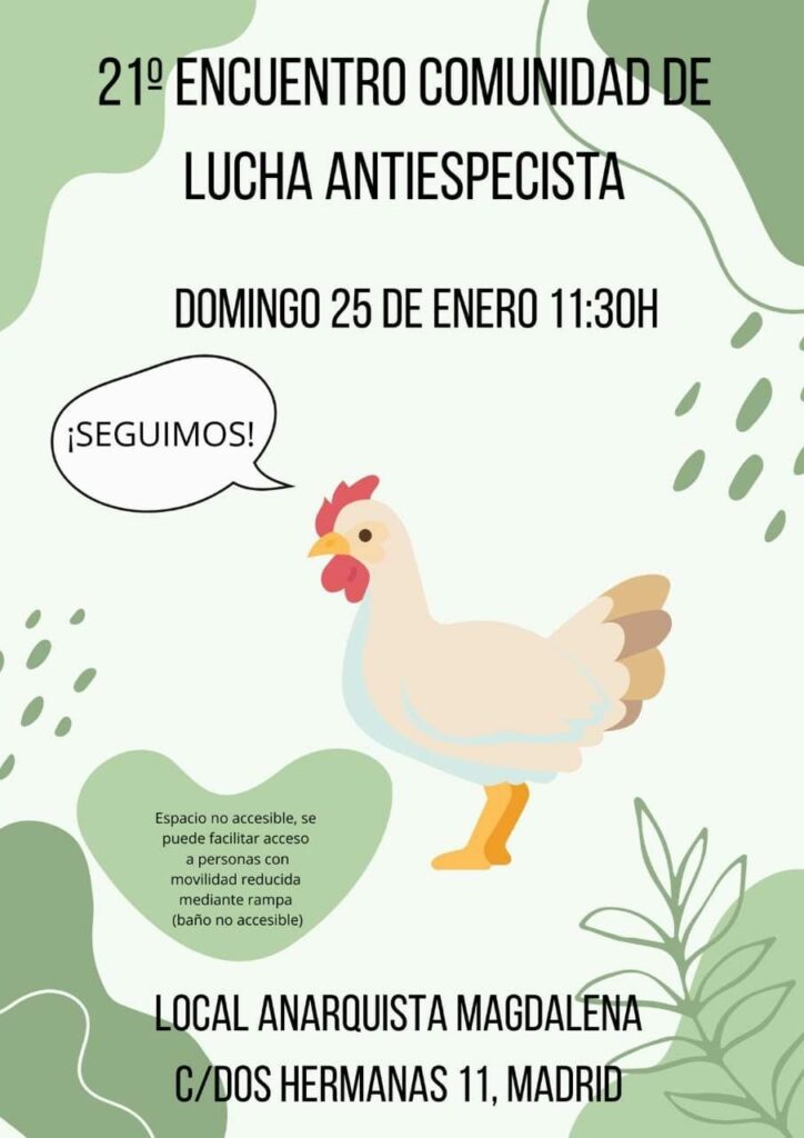 El próximo domingo 25 de enero a las 11:30h tendrá lugar en el Local Anarquista Magdalena un nuevo encuentro con el que seguir dando forma a la comunidad de lucha antiespecista, ¡anímate a venir!