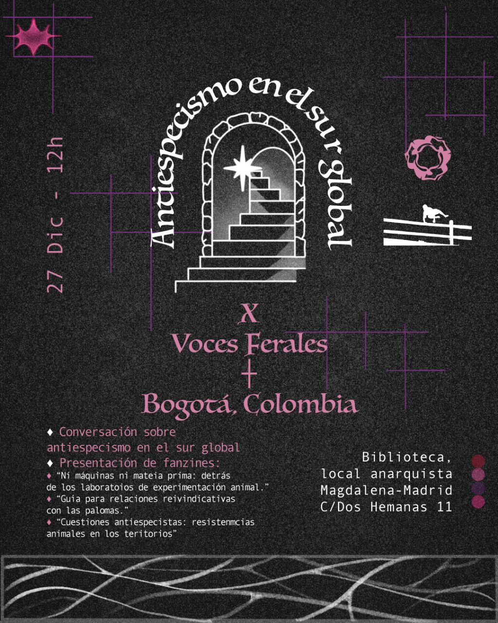 Desde Colombia, el sábado 27 de diciembre a las 12h, recibimos a las compañeras de Voces ferales que vendrán a conversar sobre el antiespecismo en el sur global y a crear nuevas alianzas.