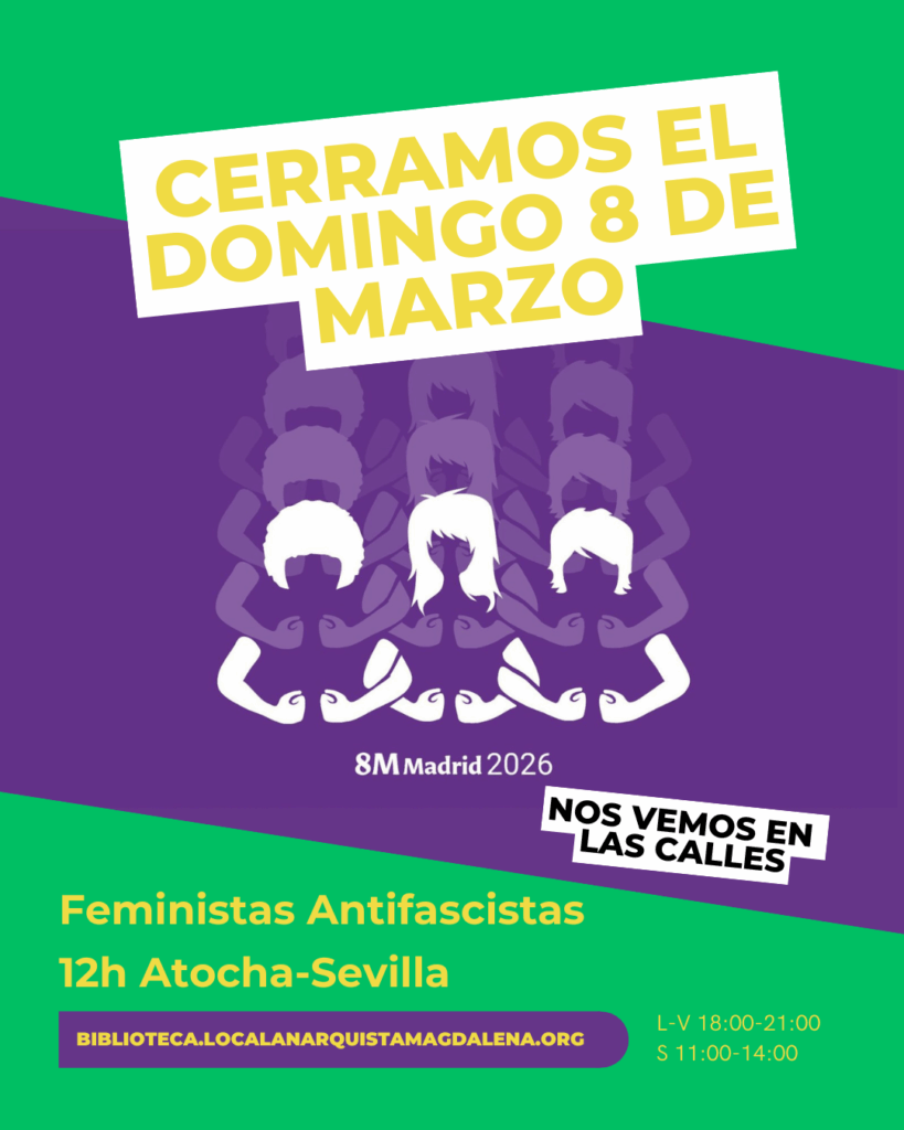El próximo domingo cerramos la biblioteca para acudir a la manifestación convocada por Feminismos Madrid: Feministas Antifascistas, somos más en todas partes. Os animamos a todes a participar de las distintas convocatorias que tienen lugar esta semana desde los barrios.