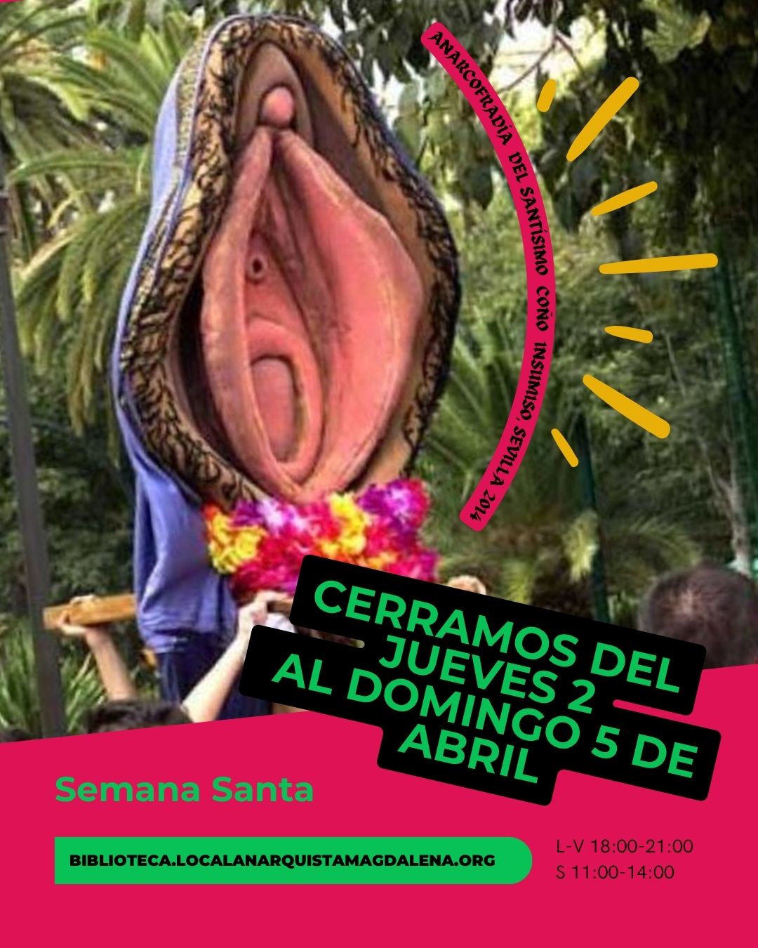 Si quieres sacar tu lectura para esta Semana Santa o devolver algún ejemplar que te hayas llevado, recuerda que el local permanecerá cerrado desde el jueves 2 hasta el domingo 5.