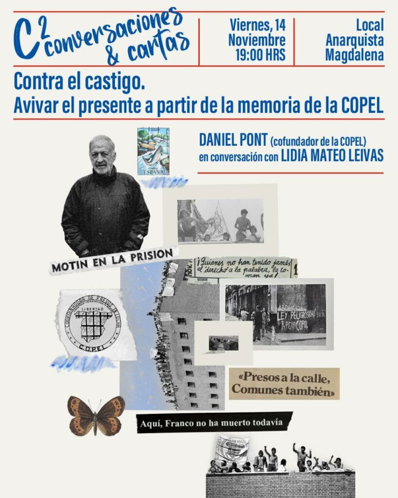 Con esta conversación buscamos encender la memoria de la COPEL de la mano de uno de sus fundadores, pero no para hacer un ejercicio de ensimismamiento con el pasado, sino para tratar de que esa lucha nos ayude a seguir pensando las formas del castigo hoy, sus raíces profundas en nuestra historia y subjetividad y, sobre todo, para que avive un presente cada vez más punitivista a partir de los saberes encarnados de uno de los colectivos que más ha tambaleado el sistema carcelario español.